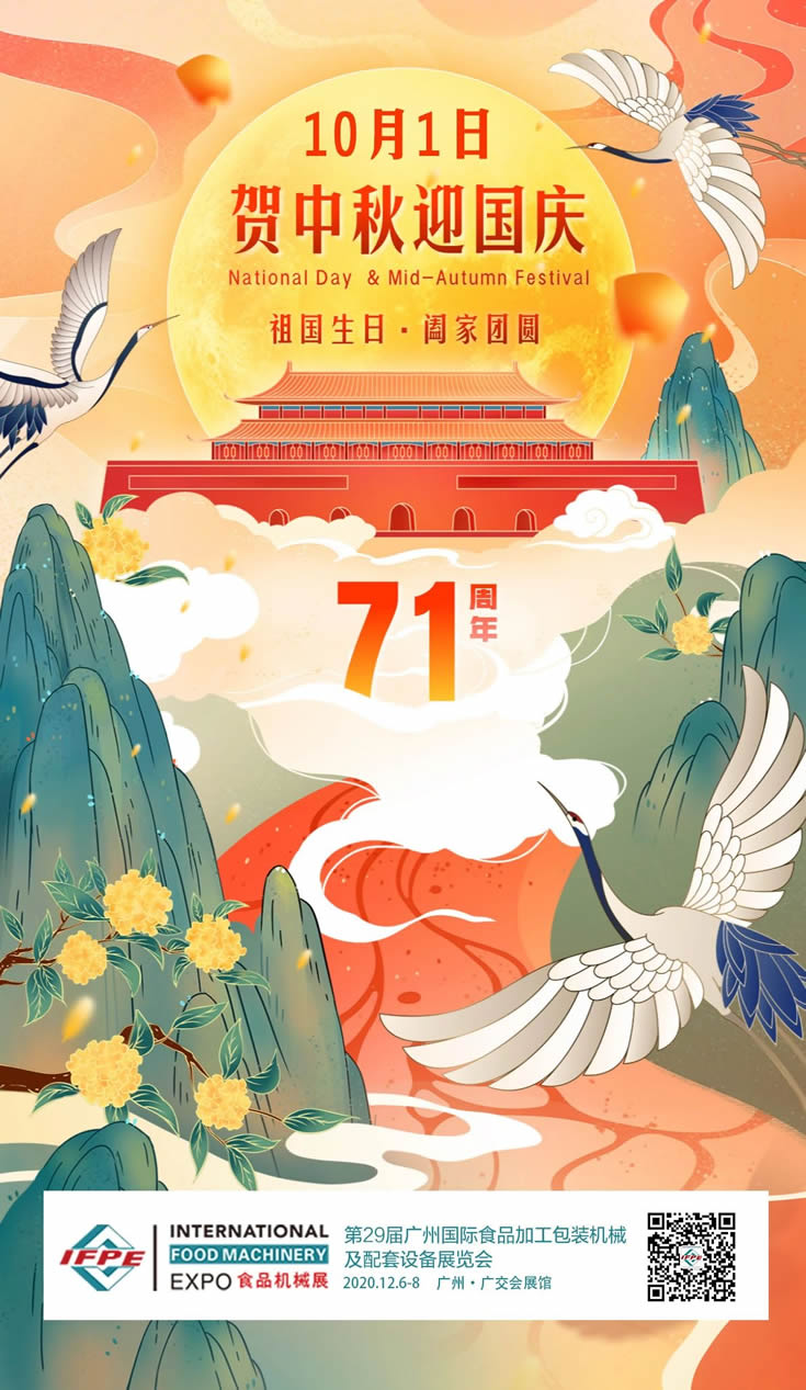 十五明月空中掛,大紅燈籠慶國(guó)慶。 IFPE廣州食品機(jī)械包裝設(shè)備展祝大家節(jié)日快樂(lè)。