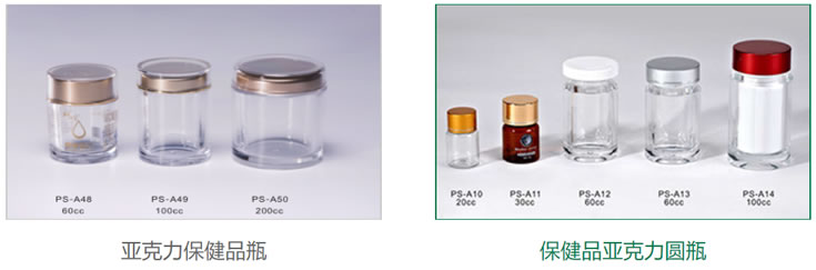 亞克力瓶透光率達(dá)92%以上,抗老化性能好。瓶子種類繁多,品相高端大氣,廣泛應(yīng)用于保健品和化妝品包裝等。