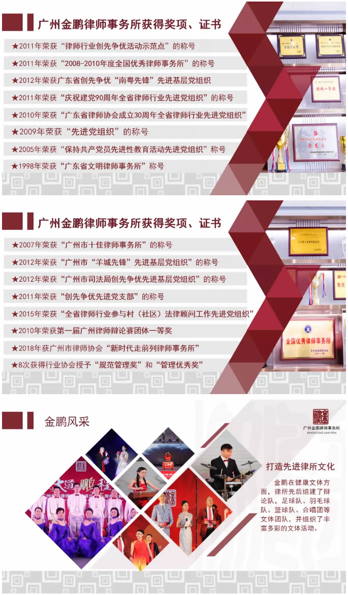 廣州金鵬律師事務(wù)所成立于1993年1月,是廣州第一家市屬合伙制律師事務(wù)所。1997年,經(jīng)司法部批準(zhǔn),金鵬成為最早在美國洛杉磯設(shè)立辦事處的中國律師事務(wù)所。2006年,金鵬購置了珠江新城寫字樓,成為廣州市首家進(jìn)駐中央商務(wù)區(qū)CBD的綜合大型律師事務(wù)所。2015年,金鵬成功獲批改制成為廣東省首批特殊普通合伙制律師事務(wù)所之一,為今后的大格局發(fā)展打下了堅實的基礎(chǔ)。經(jīng)過穩(wěn)健發(fā)展,金鵬已發(fā)展成為廣東地區(qū)最具規(guī)模的大型律師事務(wù)所之一,在全國法律界具有重要影響力。