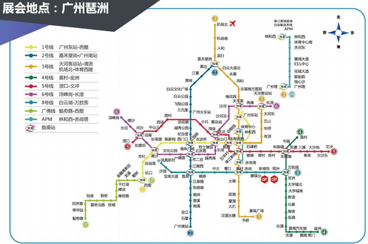 地鐵:3號線(北延長線)機(jī)場北站(2號航站樓)/機(jī)場南站(1號航站樓)- 體育西路站(轉(zhuǎn)乘3號線) - 客村站(轉(zhuǎn)乘8號線)- 新港東站A出口(廣交會展館A區(qū))。