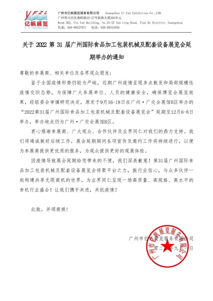 鑒于全國疫情形勢仍較為嚴(yán)峻,近期廣州疫情呈現(xiàn)多點(diǎn)散發(fā)和局部規(guī)模性疫情交織態(tài)勢,為保障廣大參展單位、人員的健康安全,確保博覽會(huì)展覽效果,經(jīng)組委會(huì)審慎研究決定,原定于9月16-18日在廣州·廣交會(huì)展館B區(qū)舉辦的“2022第31屆廣州國際食品加工包裝機(jī)械及配套設(shè)備展覽會(huì)”延期至12月6-8日舉辦,舉辦地點(diǎn)仍為廣州·廣交會(huì)展館B區(qū)。