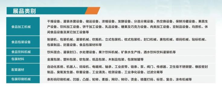 本屆IFPE食機(jī)展展品范圍涵蓋:食品加工機(jī)械、食品包裝設(shè)備、食品飲料機(jī)械、包裝材料、配套器材、包裝印刷機(jī)械等多個(gè)專業(yè)領(lǐng)域,為食品、飲料、乳品、日化、制藥、健康等行業(yè)提供豐富選擇和一站式加工及包裝解決方案。