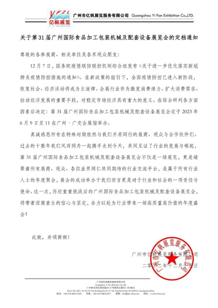 12月7日,國(guó)務(wù)院疫情聯(lián)防聯(lián)控機(jī)制綜合組發(fā)布《關(guān)于進(jìn)一步優(yōu)化落實(shí)新冠肺炎疫情防控措施的通知》。在新政策的指引下,全國(guó)疫情防控已進(jìn)入新階段,恢復(fù)社會(huì)、經(jīng)濟(jì)活動(dòng)將成為主旋律。會(huì)展行業(yè)作為激發(fā)消費(fèi)潛力、擴(kuò)大消費(fèi)需求、拉動(dòng)經(jīng)濟(jì)發(fā)展的重要手段,對(duì)穩(wěn)定市場(chǎng)經(jīng)濟(jì)具有重大的意義。在綜合研判各方面因素后決定:第31屆廣州國(guó)際食品加工包裝機(jī)械及配套設(shè)備展覽會(huì)定于2023年6月9日至11在廣州·廣交會(huì)展館舉辦。