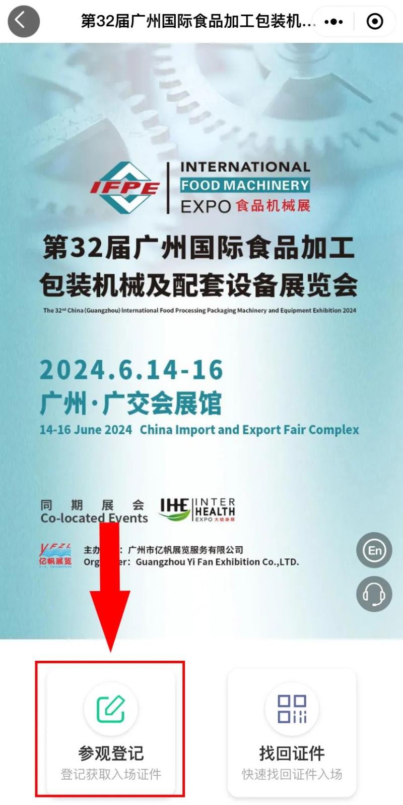 03??進(jìn)入登記系統(tǒng)步驟3:點(diǎn)擊下方“參觀登記”。 *已登記的觀眾可點(diǎn)擊右側(cè)“找回證件”,重新獲取入場碼。 |