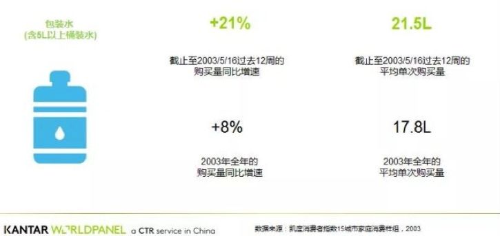 事實上,在2003年SARS期間,包裝水的銷量也在攀升。凱度消費者指數(shù)的分析揭示,2003年SARS感染高發(fā)期間,包裝水需求量凸起,尤其在北京,由于許多家庭紛紛在此期間進行大量囤貨,包裝水的購買量在2003年3-5月間增長了21%。