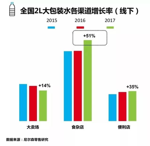據(jù)尼爾森數(shù)據(jù),盡管400-800ml的包裝水仍然主導(dǎo)市場,但2L以上大包裝增速尤其亮眼。2017年食雜店的銷量增長率達到了51%。