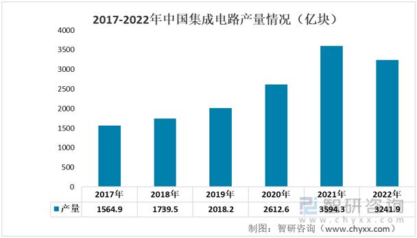集成電路在消費電子、高端制造、網(wǎng)絡(luò)通訊、家用電器、物聯(lián)網(wǎng)等諸多領(lǐng)域得到廣泛應(yīng)用,已成為衡量一個國家產(chǎn)業(yè)競爭力和綜合國力的重要標(biāo)志之一,也是工業(yè)自動化行業(yè)上游重要的原材料。從近年來我國集成電路的產(chǎn)量情況來看,呈現(xiàn)上升的態(tài)勢,集成電路從2017年的1564.9億塊上升至2022年的3241.9億塊。