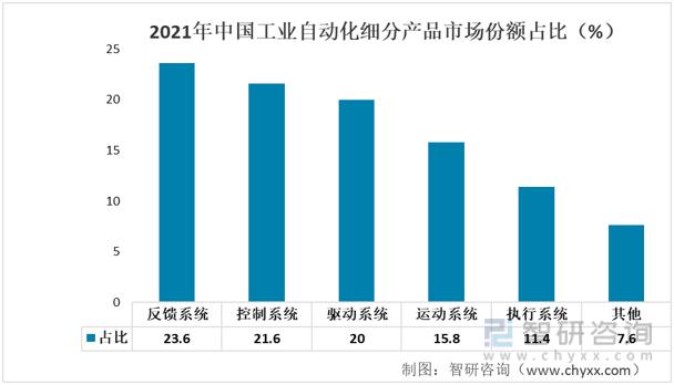 從2021年年中國工業(yè)自動化細(xì)分產(chǎn)品市場份額占比情況來看,反饋系統(tǒng)、控制系統(tǒng)、驅(qū)動系統(tǒng)占比分別為23.6%、21.6%、20%,運動系統(tǒng)、執(zhí)行系統(tǒng)占比分別為15.8%、11.4%。