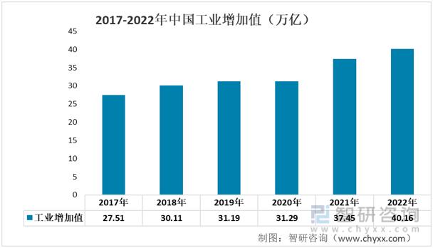 工業(yè)增加值能在一定程度商覺得工業(yè)自動化行業(yè)的景氣度。近年來隨著我國綜合實力不斷提升,我國工業(yè)增加值呈現(xiàn)上升的態(tài)勢,2017年我國工業(yè)增加值為27.51萬億,2022年工業(yè)增加值為40.16萬億元。
